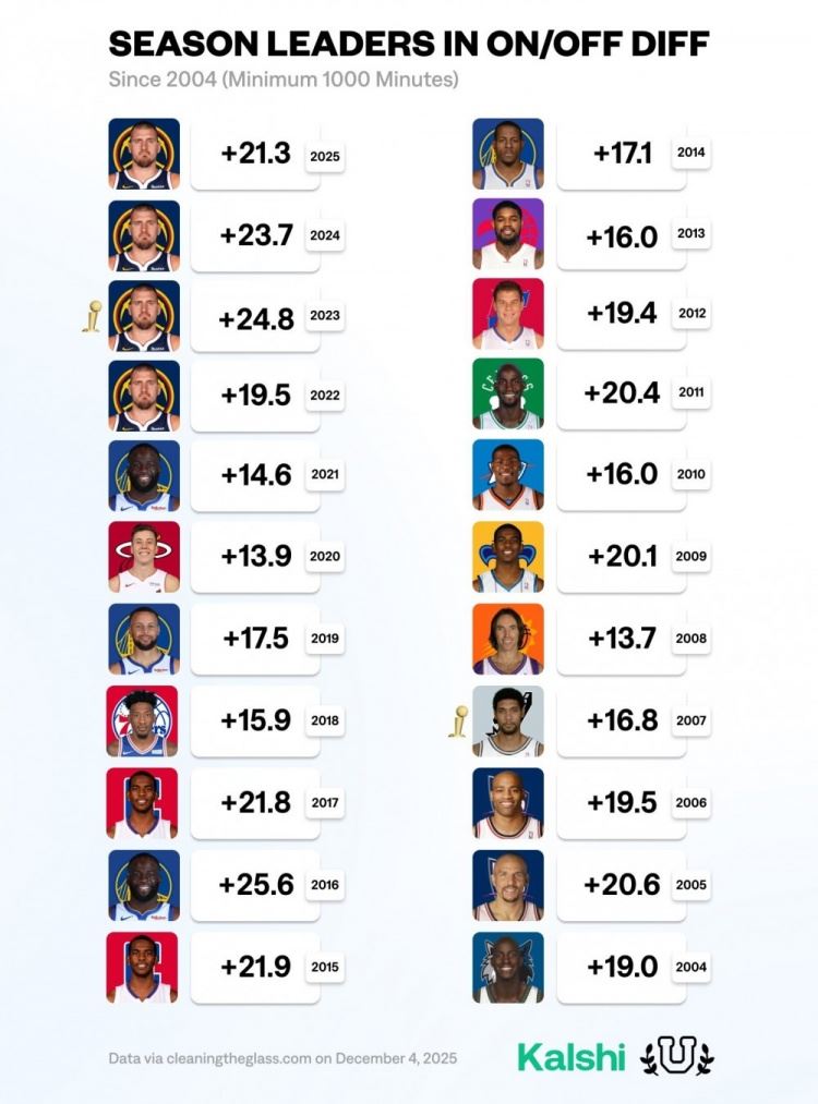 04年后在场/不在场百回合净胜分:约基奇保罗多次上榜 库追在列